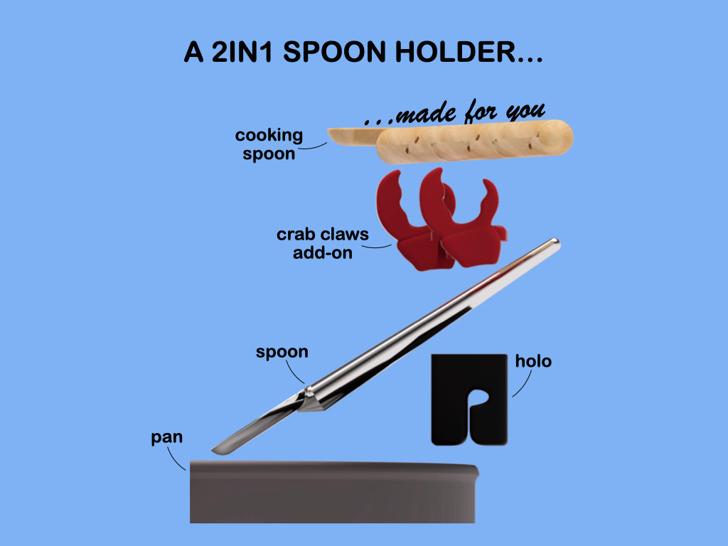 Unser Löffelhalter ist das einzige Produkt weltweit, welches eine speziell gestaltete Anlagefläche für den Löffel hat, um das Abrutschen in den Topf zu verhindern. Zudem ist holo nicht nur hitzebeständig und spülmaschinenfest, sondern auch modular aufgebaut. Aktuell kannst du die Krabbenscheren verwenden, um verschiedene Utensilien zu halten, und wir planen, in Zukunft weitere Add-ons zu entwickeln.